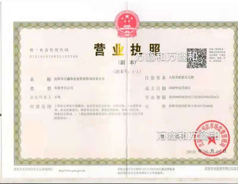 沈陽(yáng)市萬(wàn)鑫和企業(yè)管理咨詢有限公司是經(jīng)沈陽(yáng)市財(cái)政局批準(zhǔn)成立的從事代理記帳的專業(yè)化公司(執(zhí)業(yè)許可證:21010046),為各類中、小型企事業(yè)單位提供代理記帳及財(cái)務(wù)顧問(wèn)等專業(yè)服務(wù)。